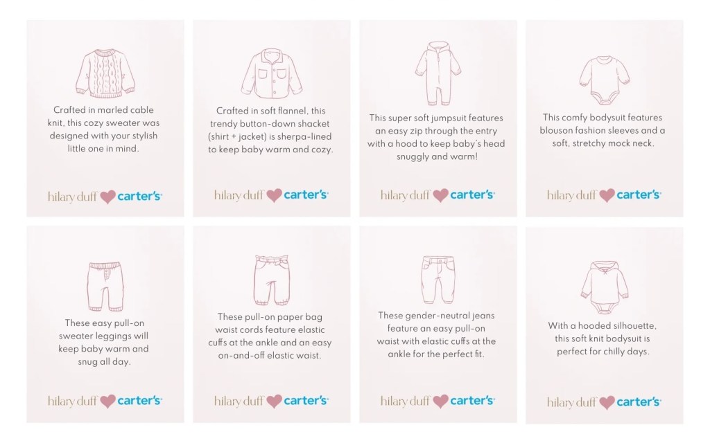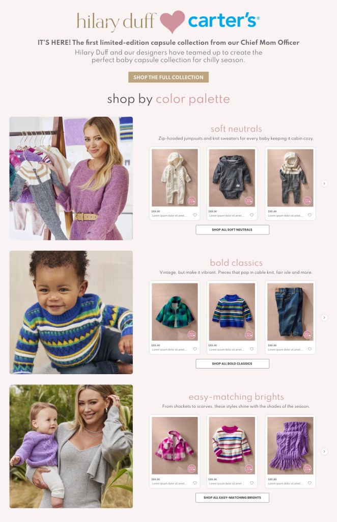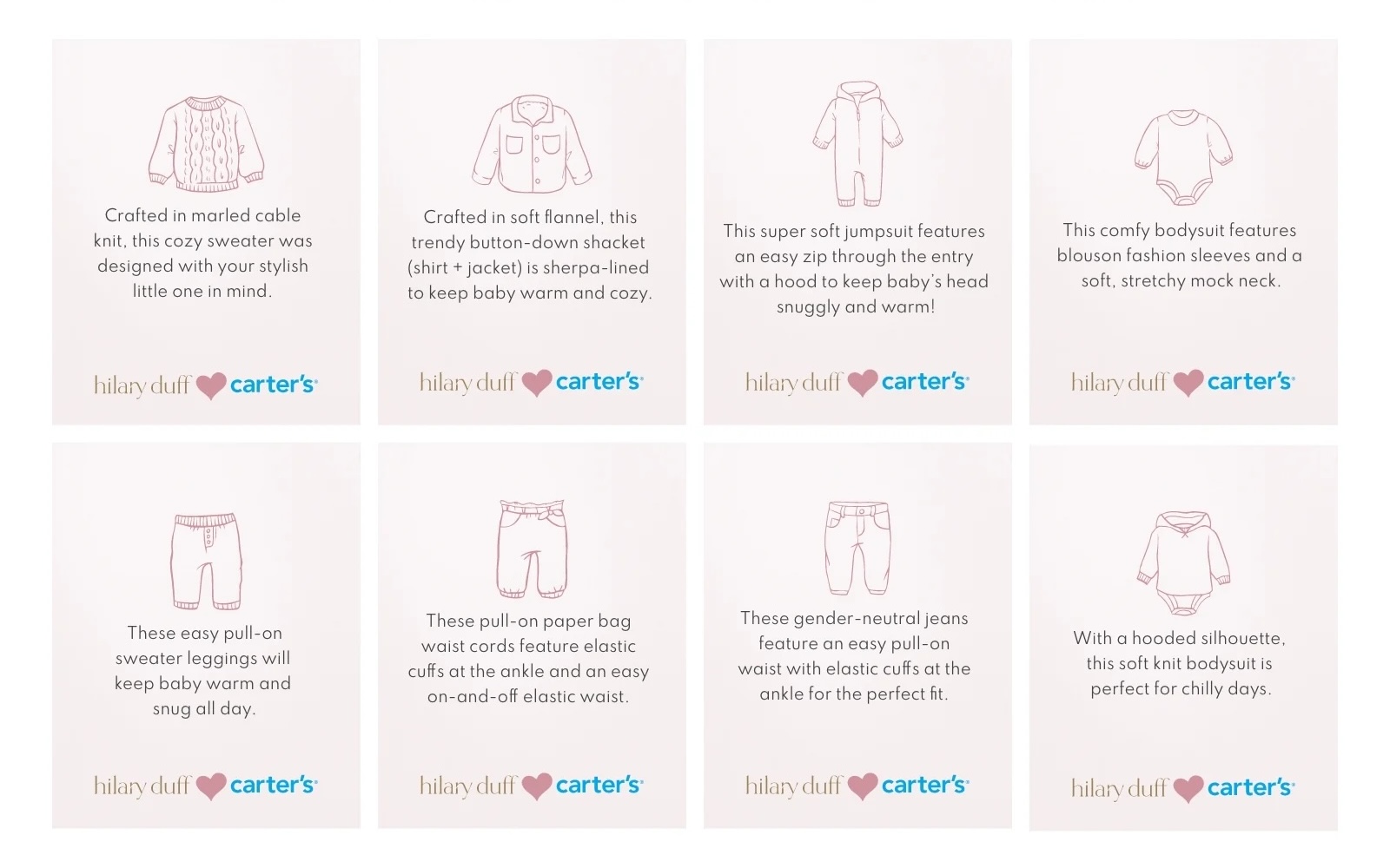 A partnership over two years in the making, Carter’s teamed up with actress, businesswoman and mom of three Hilary Duff to release two baby clothing collections. Throughout her tenure as Carter’s CMO (Chief Mom Officer, obviously), my team owned copy strategy and execution on everything from TikTok scripts to product landing pages and color stories. The collections sold out within hours.